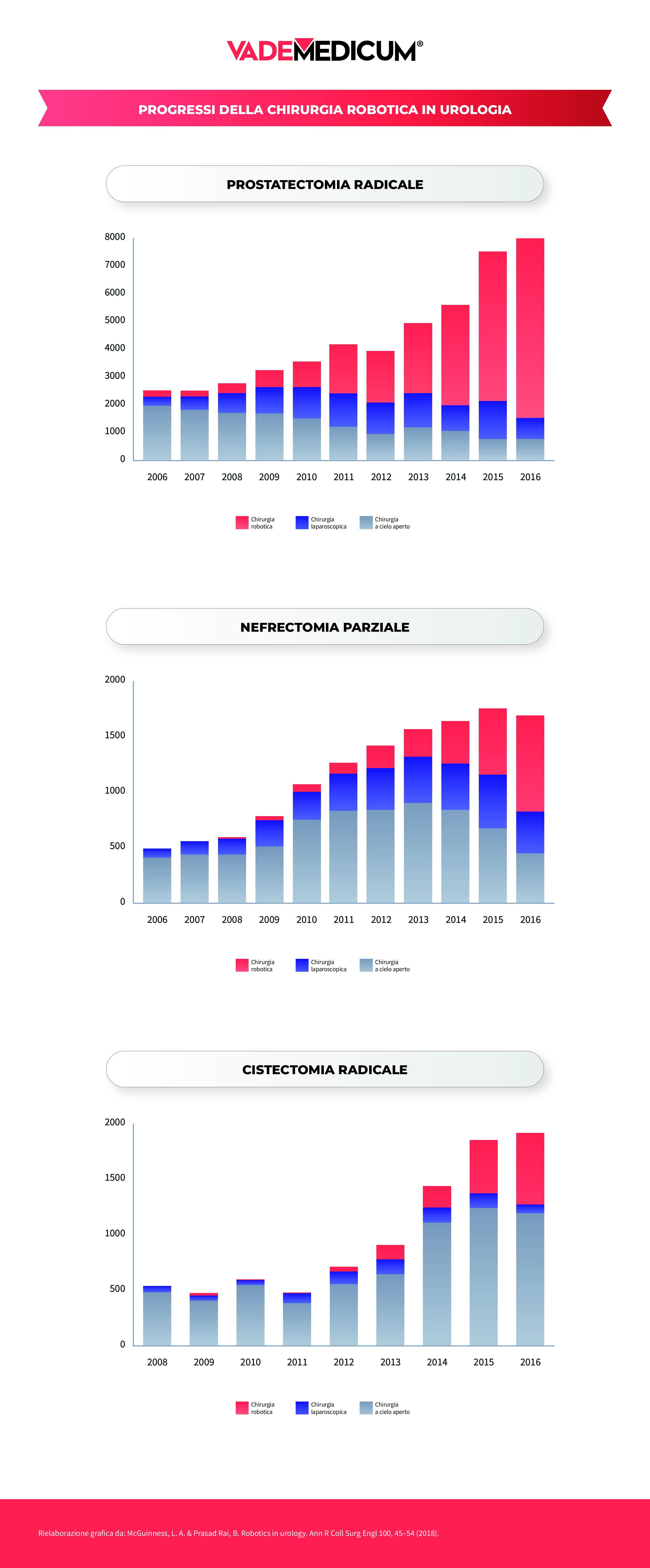 Di conseguenza, per i principali interventi di chirurgia nefro-urologica, le tecniche robotiche stanno gradualmente entrando nella routine clinica, come evidenziato dal rapporto tra interventi eseguiti con chirurgia a cielo aperto, laparoscopica e robotica osservati in diversi studi.