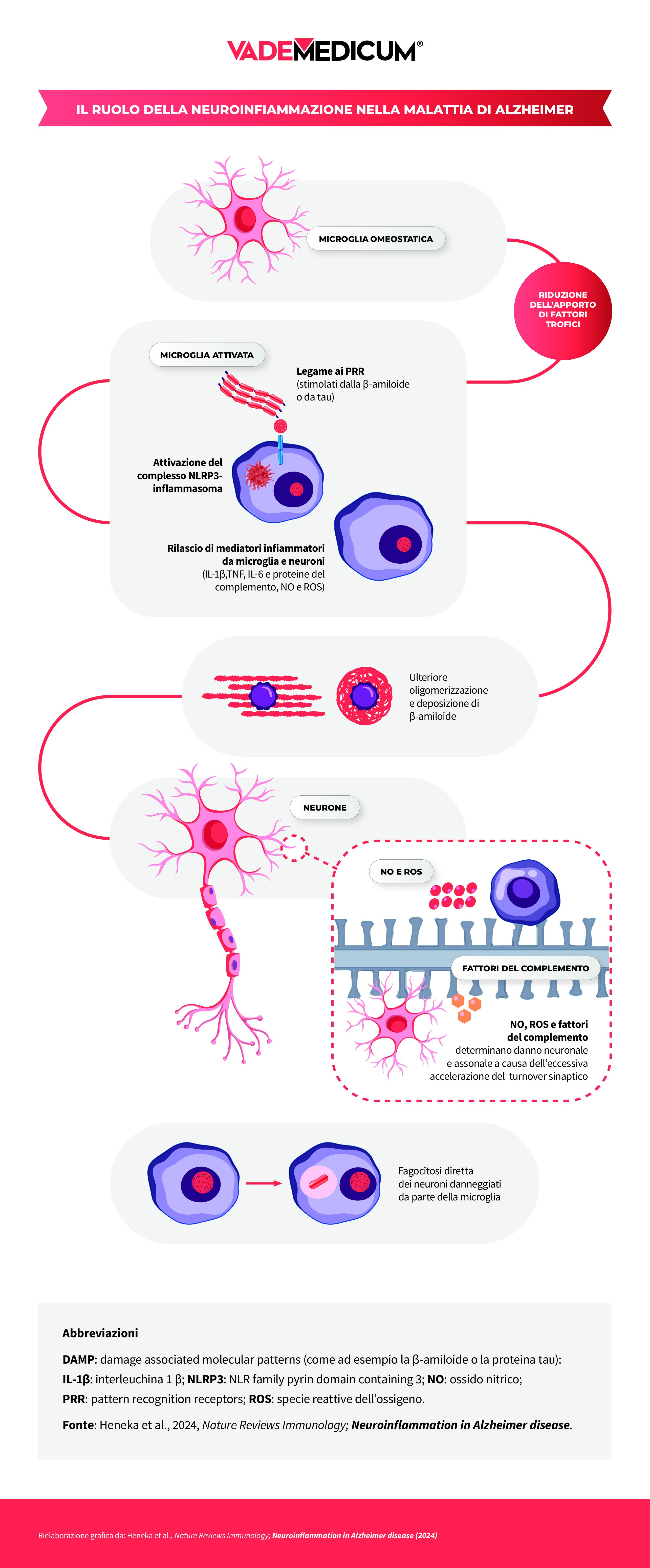 Ciò si ripercuote sui neuroni, che ​​riducono la loro produzione di fattori neurotrofici e, al contrario, generano e rilasciano ulteriori fattori immunitari come TNF e IL-6, proteine del complemento, ossido nitrico (NO) e specie reattive dell’ossigeno (ROS), che causano danno neuronale e assonale. La cronicizzazione di questa risposta può poi mettere in moto una serie di eventi che porta a morte cellulare e all’ ulteriore disseminazione di beta-amiloide nel parenchima cerebrale.